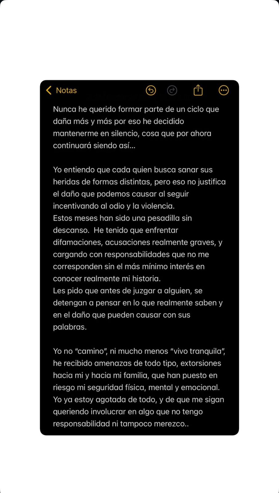 En sus publicaciones, Lattanzini compartió una serie de notas escritas por ella, en las que dejó claro que continuará guardando silencio ante la situación, algo que, según indicó, será su postura por el momento.