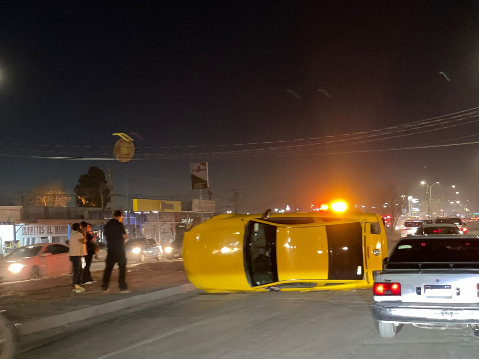 Ciudad Juárez, Chih. – La noche de ayer se registró la volcadura de un vehículo amarillo sobre la avenida Juárez Porvenir, a la altura del centro comercial Walmart.