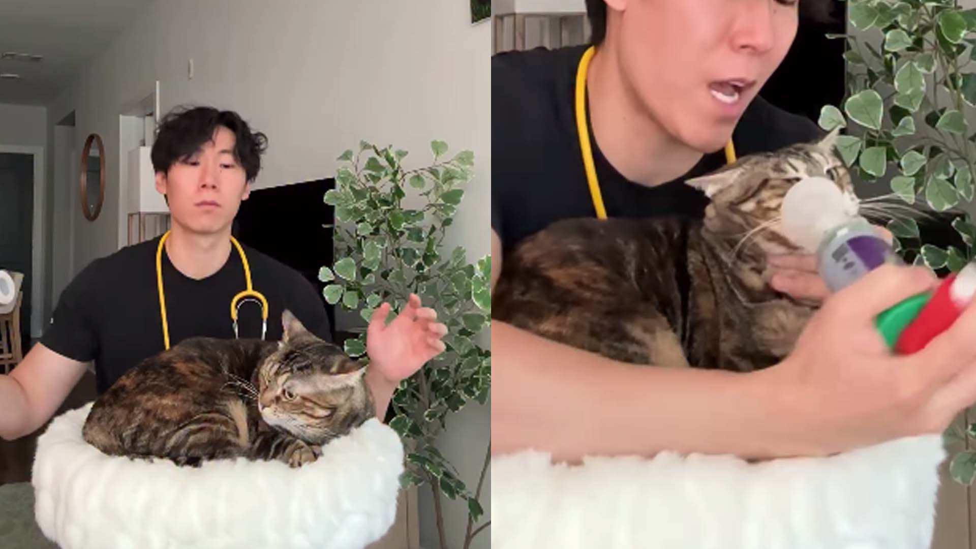 En el video, Alex aparece detrás de Bean mientras la gata descansa en su estructura habitual. De repente, le administra su dosis diaria de medicamento a través de un respirador, una acción que busca prevenir un ataque de asma. Con un tono amable y didáctico, Alex explica: