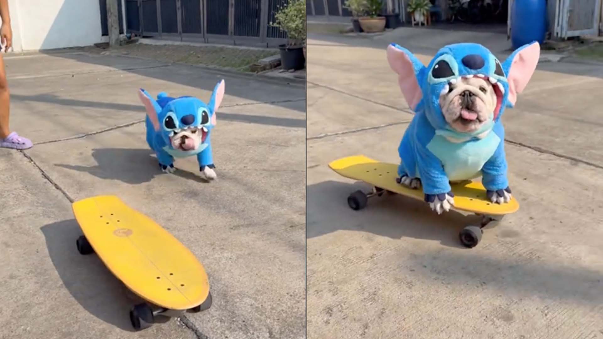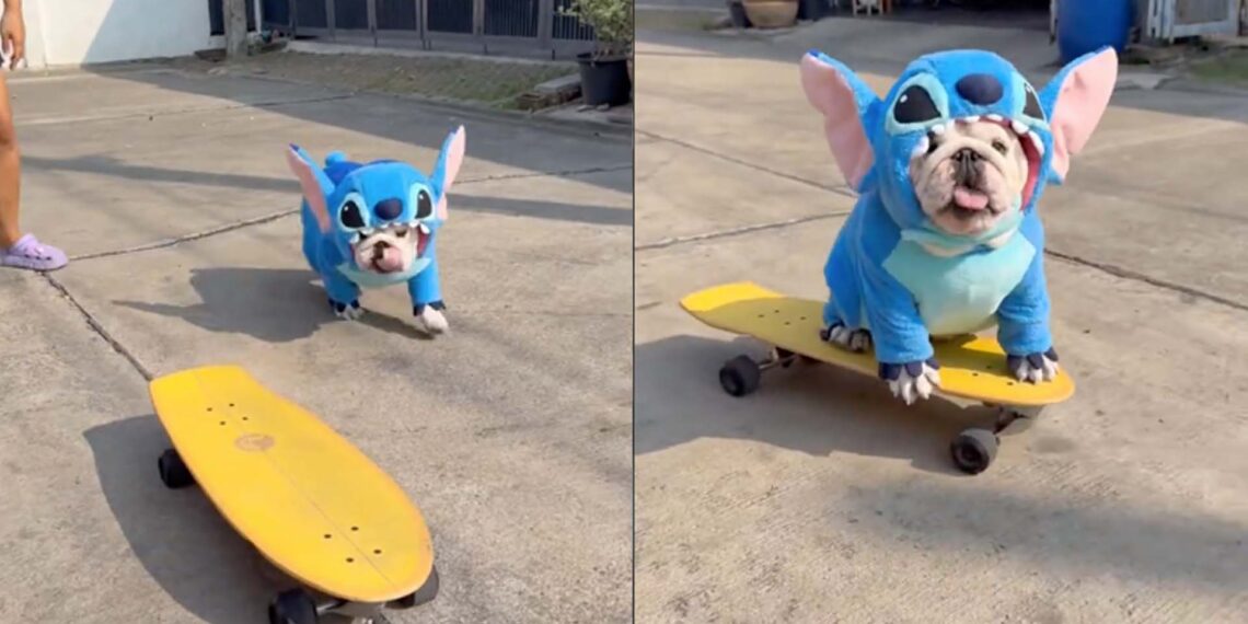 En la grabación, el can aparece vistiendo un disfraz azul inspirado en el personaje de la película “Lilo & Stitch” de Disney, mientras se desplaza con gran destreza sobre la patineta. No solo avanza con empujes de sus patas, sino que también mantiene el equilibrio de manera impresionante, lo que ha dejado a muchos espectadores boquiabiertos.