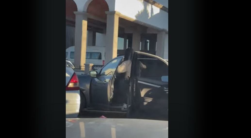 En las imágenes se observa a una mujer de cabello negro y blusa beige intentando sacar a otra de su vehículo, mientras esta última responde con patadas para defenderse.