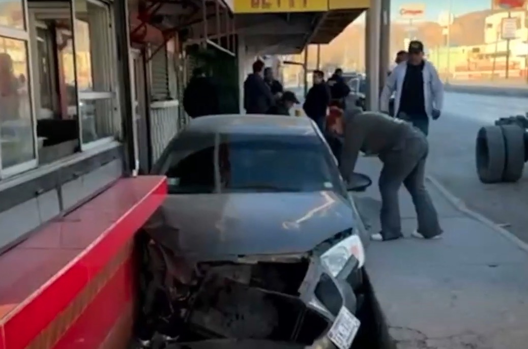 En su intento por esquivar al animal, la mujer perdió el control de su vehículo compacto y terminó incrustada en la fachada de unos negocios de comida ubicados en la esquina de la vialidad.