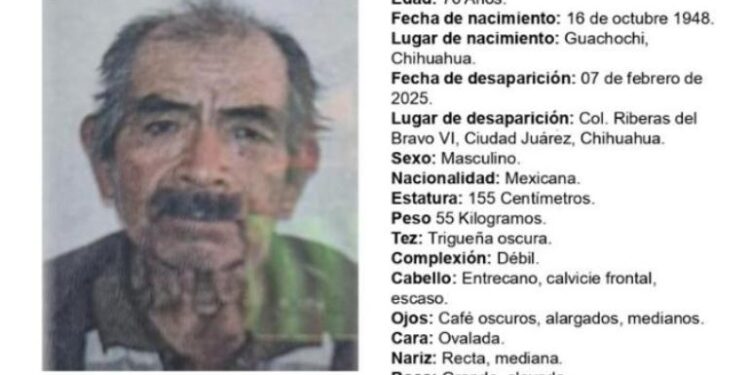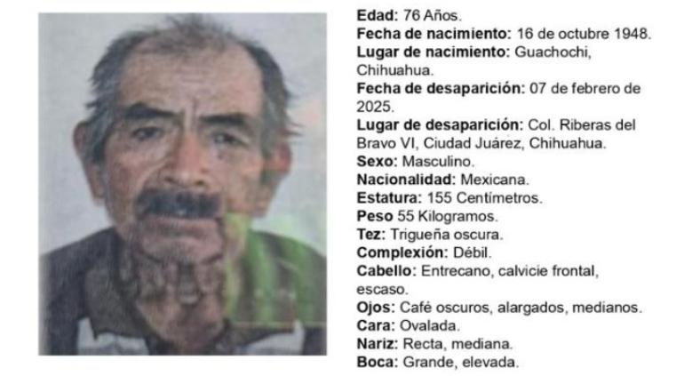 Ciudad Juárez.- Familiares y autoridades solicitan el apoyo de la comunidad para localizar a Fidencio Ramos Chaparro, un hombre de 76 años que desapareció el pasado 7 de febrero de 2025 en la colonia Riberas del Bravo VI.
