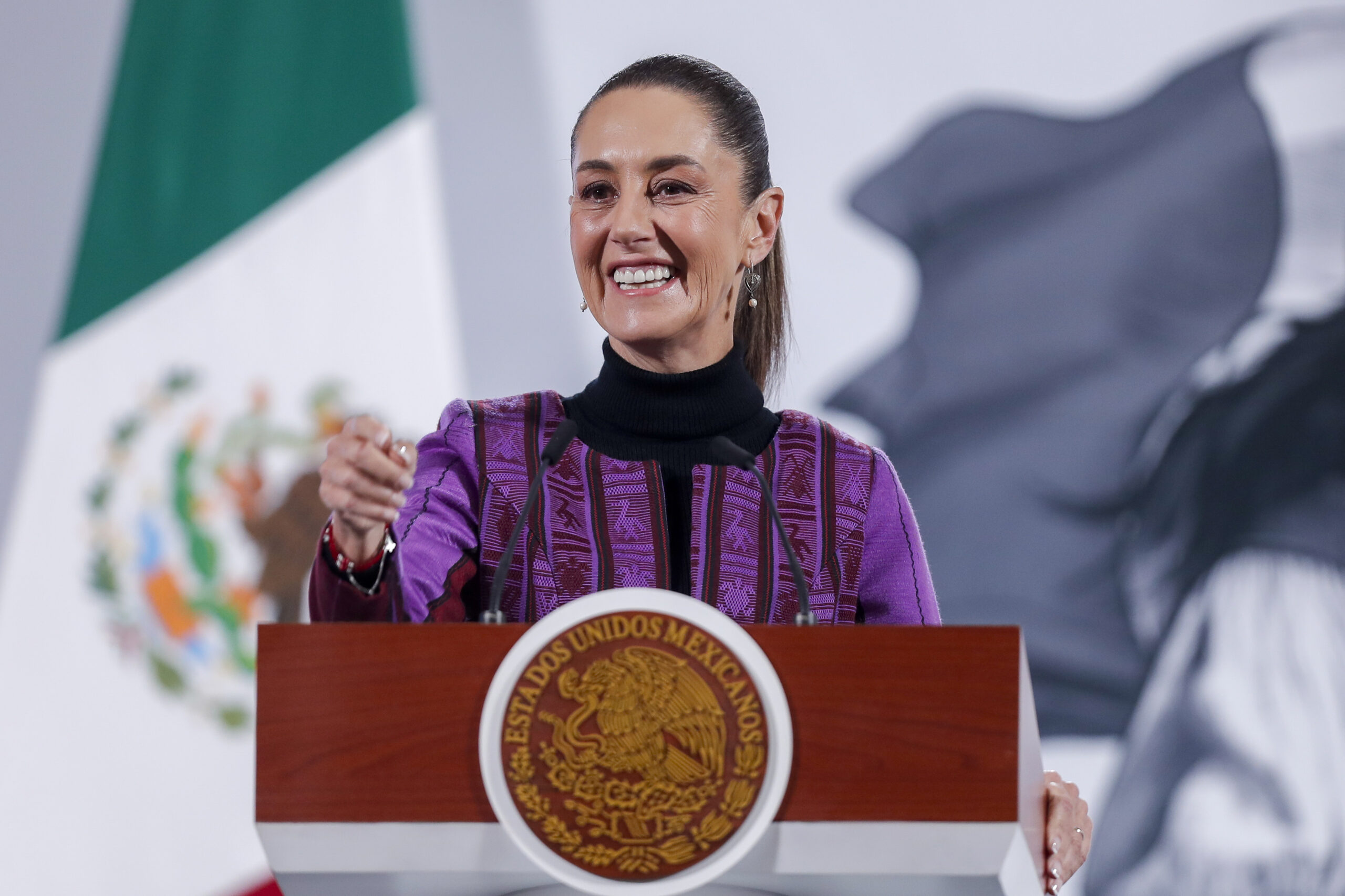 MEX3481. CIUDAD DE MÉXICO (MÉXICO), 20/02/2025.- La presidenta de México, Claudia Sheinbaum, habla durante una rueda de prensa este jueves, en Palacio Nacional de la Ciudad de México (México). Sheinbaum cosecha atención internacional y popularidad interna al cumplirse un mes del nuevo Gobierno del presidente, Donald Trump, en Estados Unidos, por la forma en la que ha manejado los amagos de aranceles, la cooperación contra el narcotráfico y la migración. EFE/ Isaac Esquivel