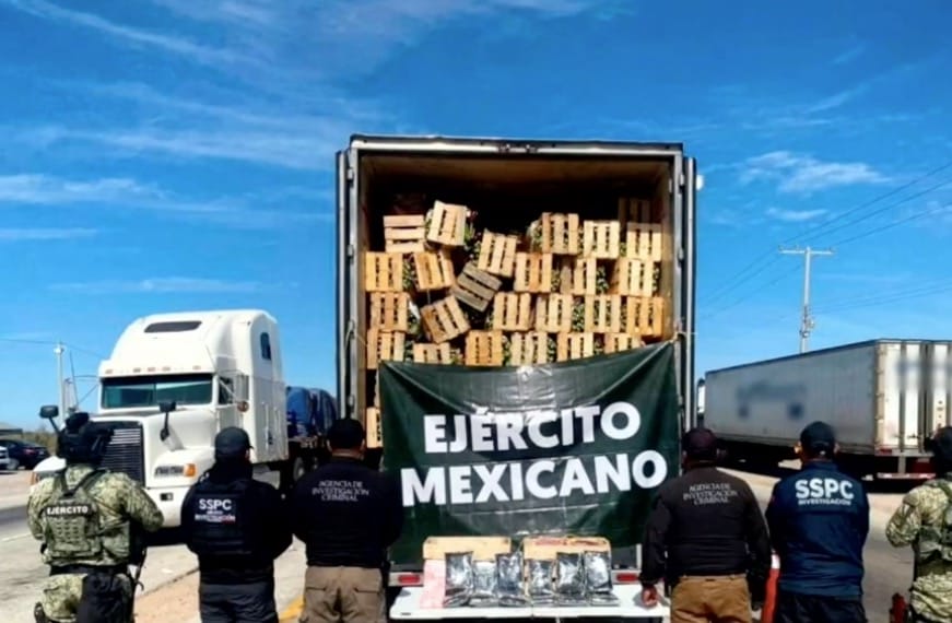 Navojoa – Los Mochi.- En un puesto de inspección vehicular sobre la carretera federal 1460, tramo Navojoa-Los Mochis, elementos de seguridad aseguraron un cargamento de fentanilo escondido un tráiler cargado con cajas con nopales.