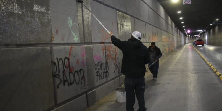 Borran grafitis en paso a desnivel del Centro Histórico tras manifestaciones