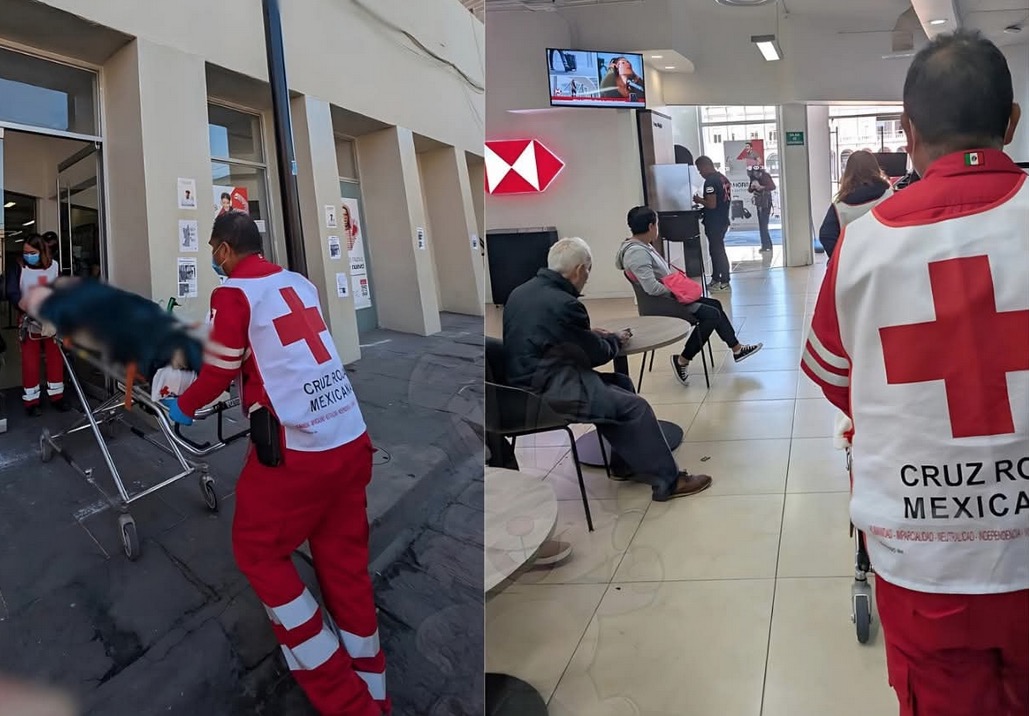 Una adulta mayor fue trasladada en camilla hasta una sucursal de HSBC en la capital de San Luis Potosí