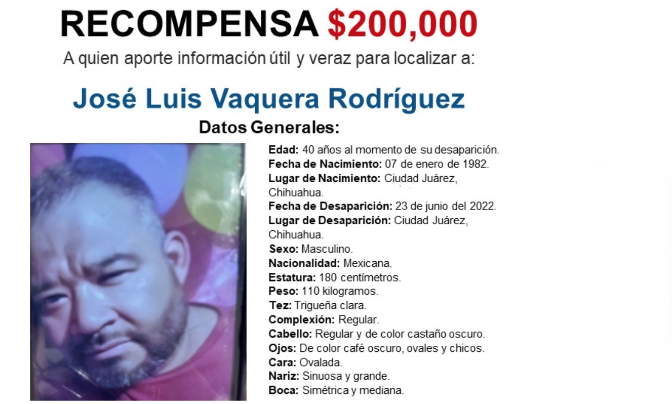 Ciudad Juárez.-Las autoridades de Ciudad Juárez han lanzado una recompensa de 200,000 pesos a quienes proporcionen información que conduzca a la localización de José Luis Vaquera Rodríguez, un hombre de 40 años que fue visto por última vez el 23 de junio de 2022.