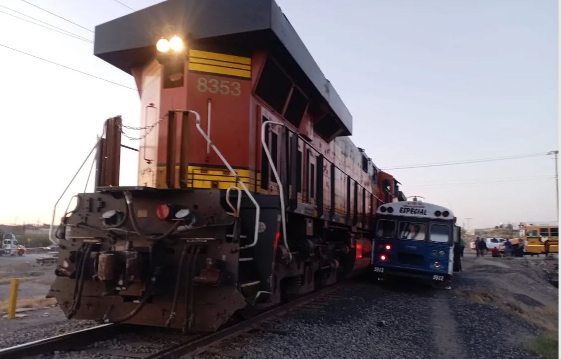 Un accidente ocurrido esta mañana en el cruce del eje vial Juan Gabriel y Parque Industrial Azteca dejó un saldo de 24 trabajadores lesionados, luego de que un tren arrastrara un camión de transporte de personal que trasladaba a empleados de la maquiladora Perler.