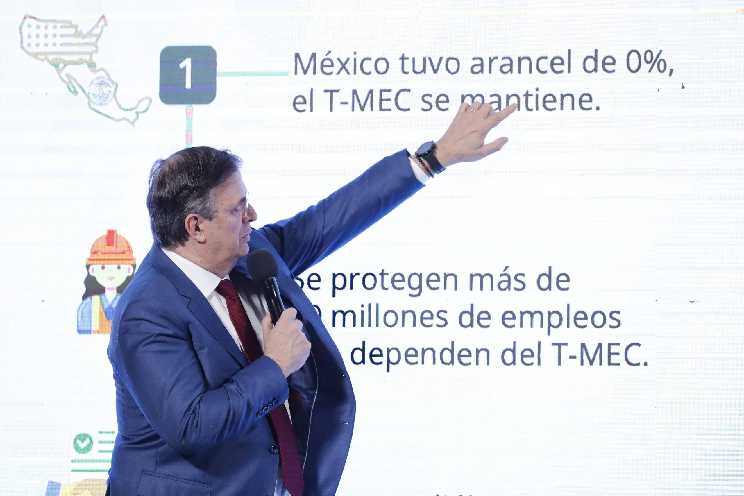 México.- El secretario de Economía, Marcelo Ebrard, habla durante una rueda de prensa este jueves, en Palacio Nacional de Ciudad de México (México). El Gobierno mexicano celebró que el Tratado entre México, Estados Unidos y Canadá (T-MEC) “sobrevivió” al anuncio de aranceles al resto del mundo que hizo este miércoles el presidente estadounidense, Donald Trump.