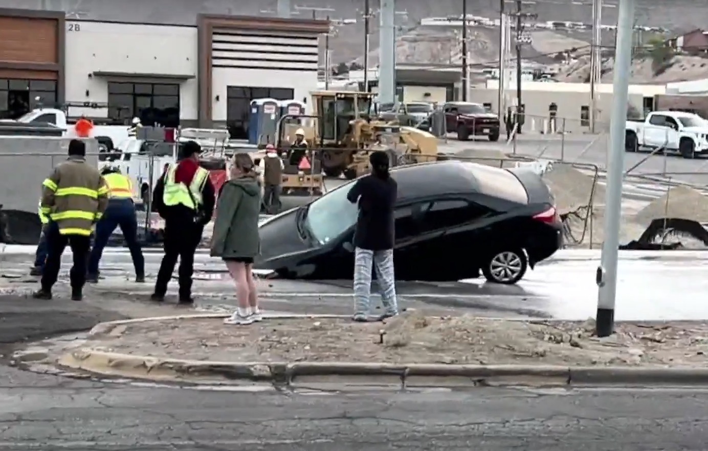 El Paso, Texas.- Un automóvil Nissan negro terminó dentro de un socavón la mañana de este jueves, luego de que el pavimento colapsara sobre el cruce de las calles Executive y Mesa.