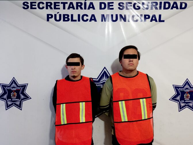 Ciudad Juárez, Chihuahua.- Agentes de la Secretaría de Seguridad Pública Municipal detuvieron a Oscar Elián G. C., César Jesús G. R. y dos adolescentes, por su presunta responsabilidad en la comisión de delitos contra la ley federal de armas de fuego y explosivos
