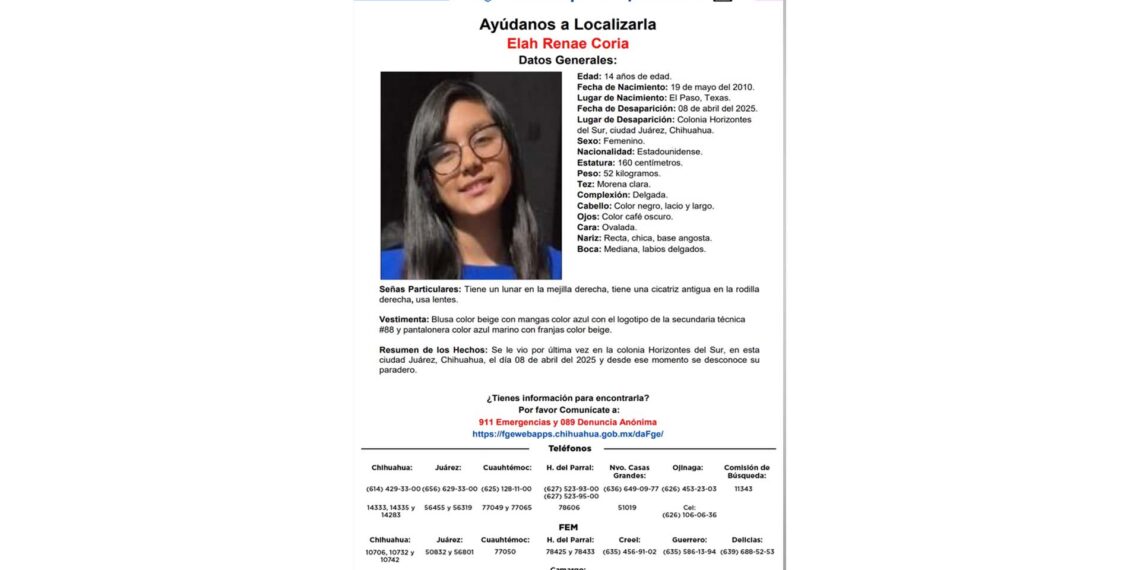 Ciudad Juárez, Chihuahua.- La Fiscalía General del Estado de Chihuahua emitió una ficha de búsqueda para localizar a Elah Renae Coria, una adolescente de 14 años que fue vista por última vez el pasado 8 de abril de 2025 en la colonia Horizontes del Sur, en Ciudad Juárez.