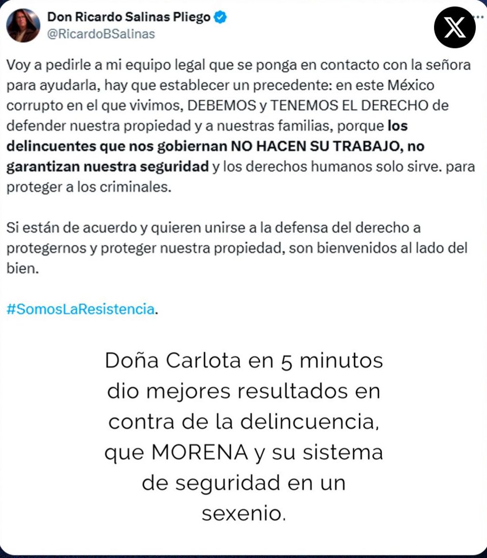 El empresario mexicano Ricardo Salinas Pliego anunció en redes sociales que está dispuesto a brindar apoyo legal a Carlota ‘N’, quien fue detenida por disparar y matar a dos personas mientras intentaba recuperar su propiedad presuntamente invadida en Chalco, Estado de México.