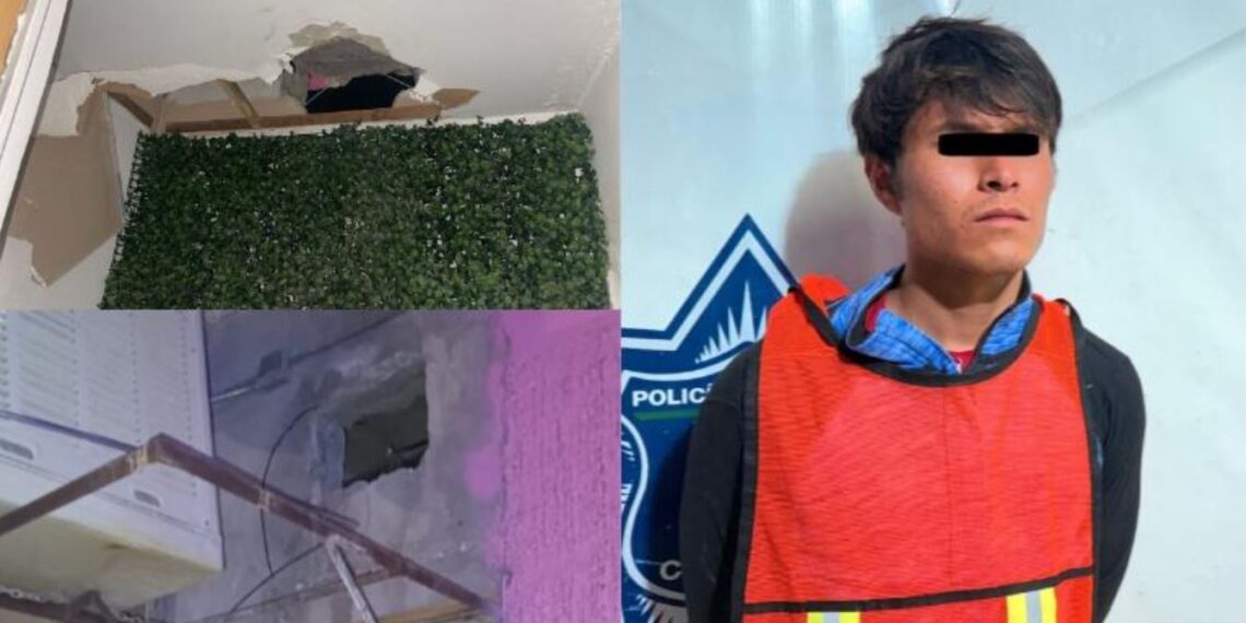 Al ingresar al establecimiento, los agentes encontraron al sujeto en el área de cobro. El presunto delincuente habría accedido al negocio perforando el techo del lugar, lo que provocó daños considerables.