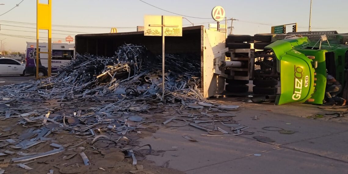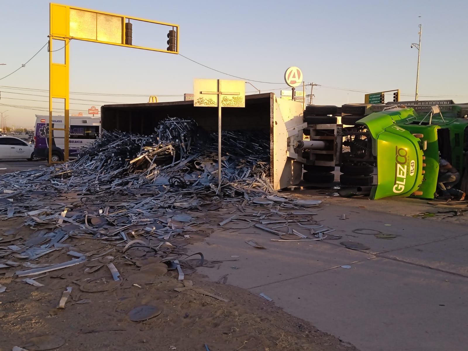 Ciudad Juárez, Chihuahua.- La mañana de este jueves se registró la volcadura de un camión materialista que transportaba láminas en el cruce de Talamas Camandari y Lote Bravo, al suroriente de Ciudad Juárez. De acuerdo con los primeros reportes, el peso de la carga provocó que el tracto perdiera estabilidad y volcara sobre la carpeta asfáltica.