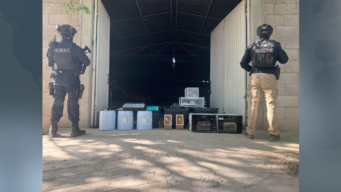 Dentro de la unidad fueron localizados más de 91 litros de precursores químicos para la fabricación de cocaína, así como tres prensas de madera y otros artículos relacionados con la producción de drogas.
