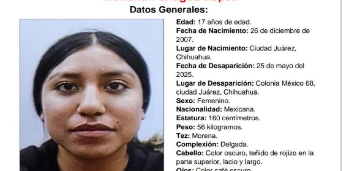 Ciudad Juárez, Chihuahua.- La comunidad de Ciudad Juárez se encuentra en alerta por la desaparición de Mariana Penagos López, una joven de 17 años vista por última vez el pasado domingo 25 de mayo en la colonia México 68.