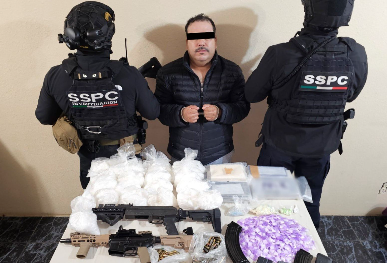 El titular de la SSPC acompañó su publicación con una imagen que muestra al arrestado, de 42 años, así como los 15 kilos de droga, 500 pastillas, tres armas largas, cinco cargadores y los 300 cartuchos útiles decomisados.