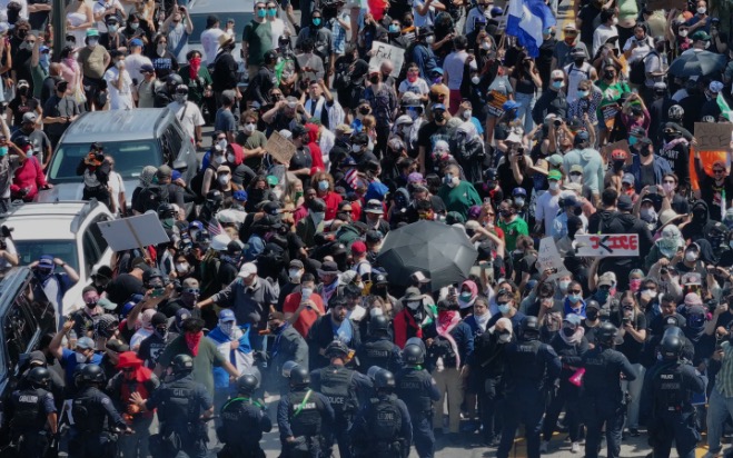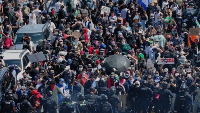 “Lo que están presenciando en California es un ataque total a la paz, al orden público y a la soberanía nacional, perpetrado por alborotadores que portan banderas extranjeras con el objetivo de prolongar una invasión extranjera de nuestro país. No vamos a permitir que eso suceda”, dijo Trump durante un mitin celebran en Fort Bragg, la mayor base militar en suelo estadounidense.