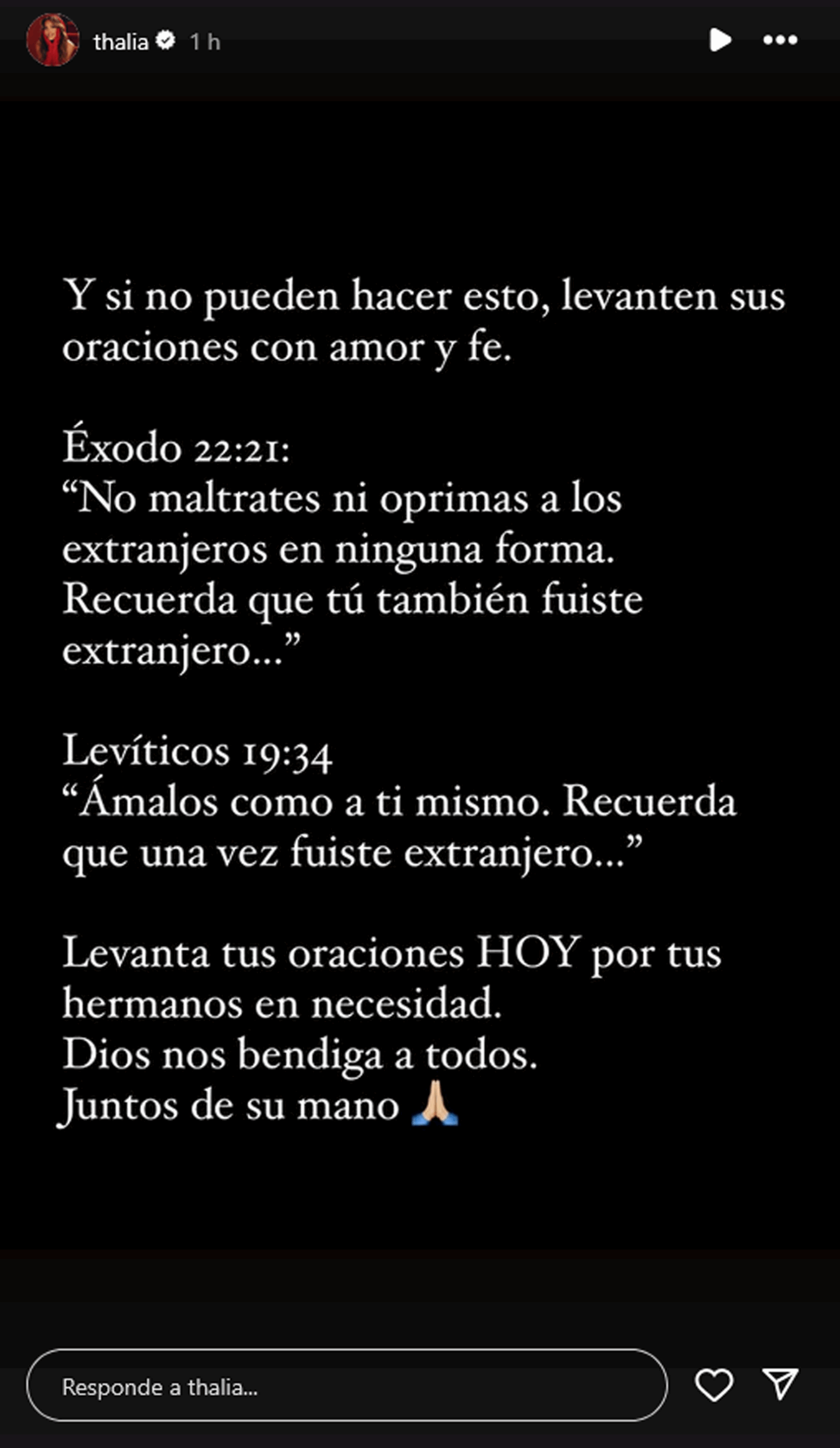 Thalía añadió que nadie debería vivir algo así, pues representa “un golpe directo a la dignidad humana”. Aseguró que se siente abrumada, angustiada y sin rumbo ante lo que sucede, pero reafirmó su compromiso al compartir enlaces y datos de organizaciones que ayudan a la comunidad inmigrante.
