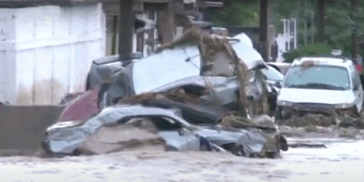 Videos captados en el lugar muestran cómo el agua arrancó pedazos de concreto, impactó automóviles contra bardas, y arrastró incluso un camión de transporte de personal.