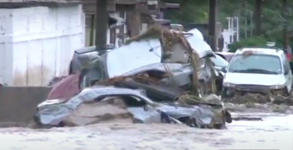 Videos captados en el lugar muestran cómo el agua arrancó pedazos de concreto, impactó automóviles contra bardas, y arrastró incluso un camión de transporte de personal.