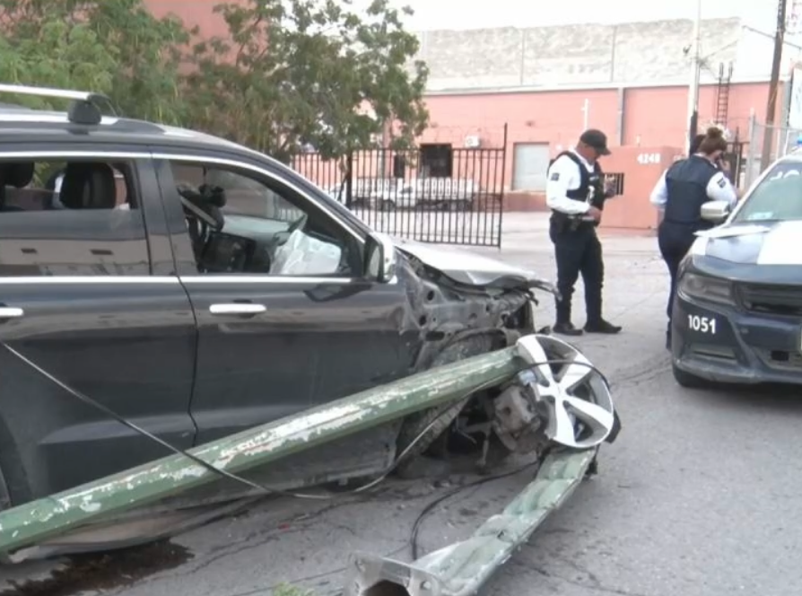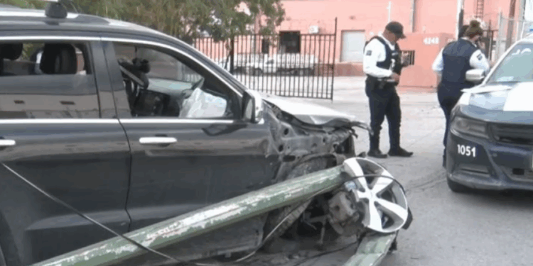Juárez. — Una camioneta terminó severamente dañada luego de que su conductor perdiera el control y se impactara contra un poste en el cruce del Eje Vial Juan Gabriel y la calle El Vergel.