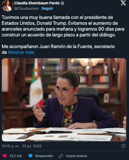 CIUDAD DE MÉXICO, 31 de julio de 2025 — La presidenta de México, Claudia Sheinbaum, informó este miércoles que logró un acuerdo con el presidente de Estados Unidos, Donald Trump, para evitar el incremento de aranceles a productos mexicanos que estaba previsto para entrar en vigor el 1 de agosto. Ambos gobiernos acordaron un plazo de 90 días para negociar un acuerdo de largo alcance.