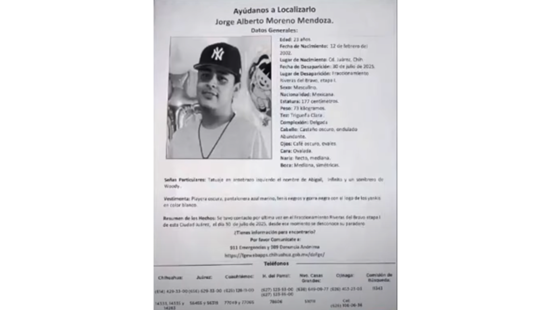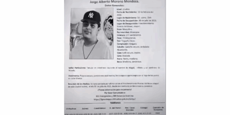 Ciudad Juárez, Chih.- Familiares y amigos de Jorge Alberto Moreno Mendoza, de 23 años, solicitan el apoyo de la ciudadanía para dar con su paradero. Fue visto por última vez el 30 de julio en el fraccionamiento Riberas del Bravo etapa uno.