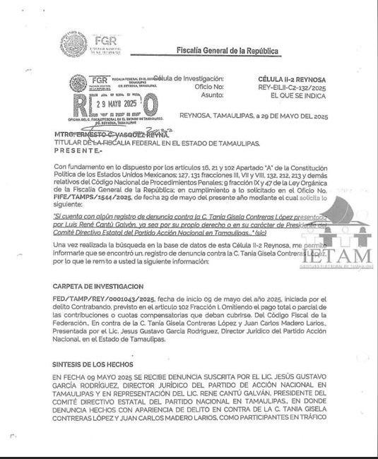 De acuerdo con documentos obtenidos por El Universal, la indagatoria forma parte de la carpeta de investigación FED/TAMP/REY/0000954/2025, iniciada el 26 de abril de este año, tras una denuncia presentada por Jesús Gustavo García Rodríguez, director jurídico del Comité Directivo Estatal del PAN en Tamaulipas, en representación de René Cantú Galván, presidente estatal del partido.