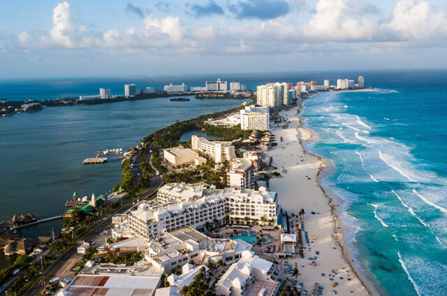 Aerial of the Zona Hotelera at Cancun.