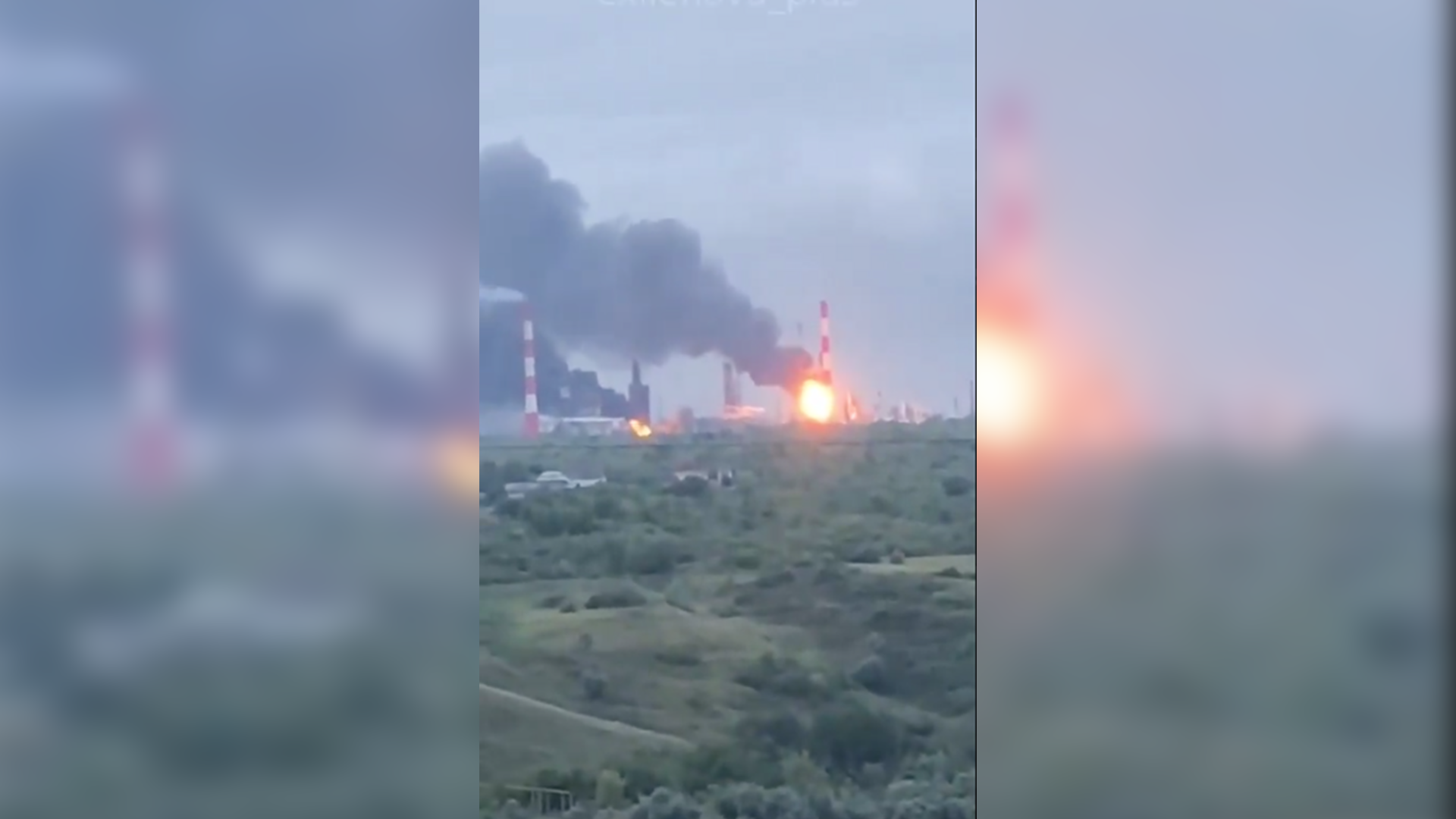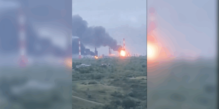 Imágenes no verificadas difundidas en redes sociales muestran columnas de humo saliendo de instalaciones industriales en llamas, presuntamente en Sizran.