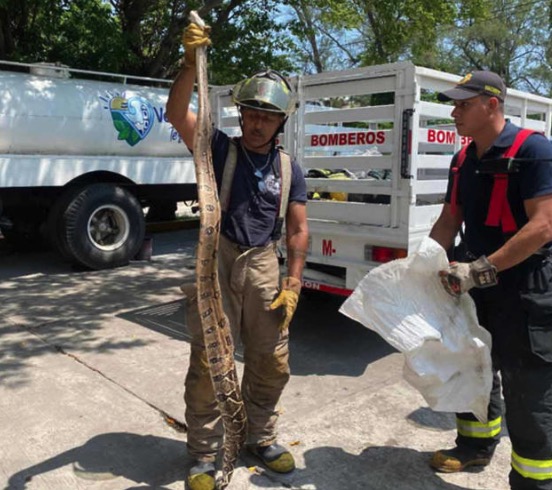 Veracruz.— La mañana de este jueves, elementos del Cuerpo de Bomberos Municipales de Veracruz capturaron una boa constrictor de aproximadamente dos metros de longitud, la cual fue localizada devorando a un gato frente a la base norte de la corporación, sobre la avenida Matamoros, junto al DIF Municipal, en el fraccionamiento Los Pinos.