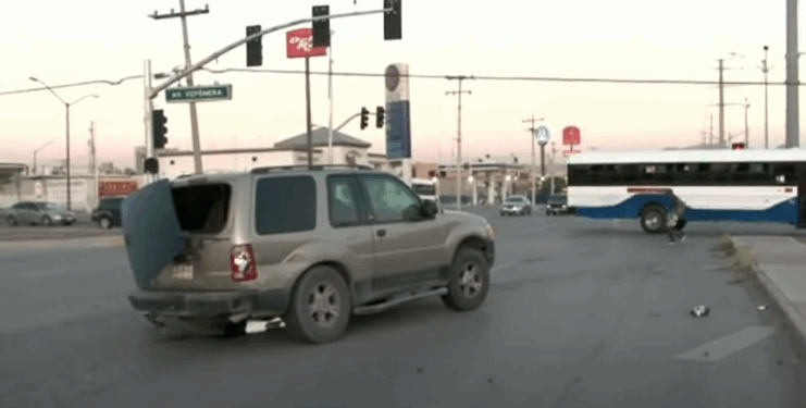 Ciudad Juárez, Chih.- Un accidente vial entre una camioneta Ford Explorer y un camión de transporte de personal marcado con el número 10414 provocó afectaciones en la circulación este jueves, en el cruce de las calles Yepómera y Santiago Troncoso. A pesar de lo aparatoso del impacto, no se reportaron personas lesionadas, únicamente daños materiales considerables, especialmente en la camioneta particular.