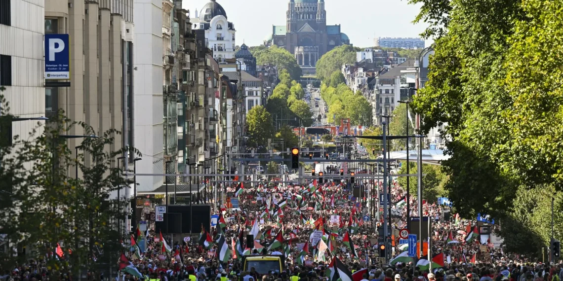 Vestidos de rojo, con pancartas hechas a mano y miles de banderas palestinas, los manifestantes formaron una marea roja que recorrió la ciudad desde la Estación del Norte hasta el corazón del barrio europeo durante la soleada tarde del domingo.