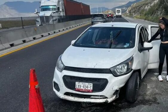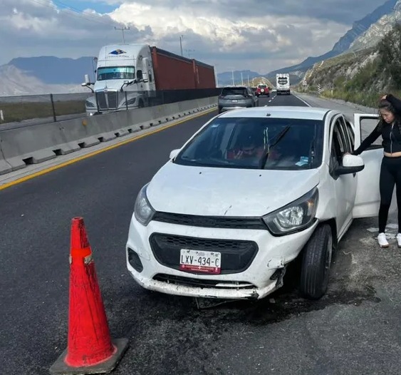 García, Nuevo León. Un accidente vial registrado la tarde de este jueves en el kilómetro 64 de la autopista a Saltillo dejó como saldo cuatro personas lesionadas, entre ellas el conductor del vehículo, quien sufrió una probable fractura en un brazo.