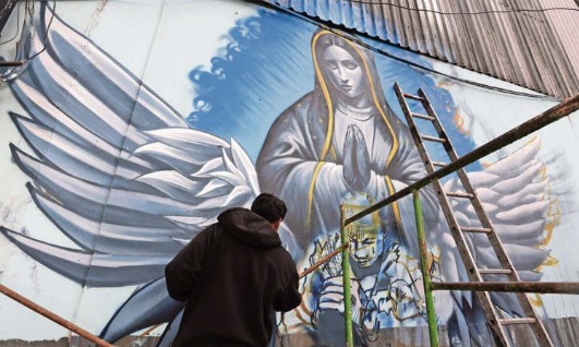 Mientras familiares y amigos le daban el último adiós en Los Reyes La Paz, el muralista plasmaba el rostro de la abuelita acompañado de una Virgen de Guadalupe, como símbolo de protección y fe.