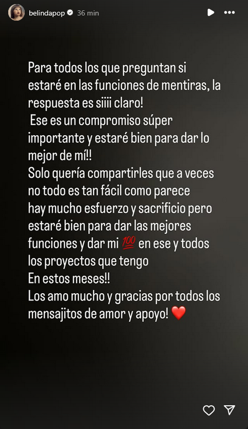 “Para todos los que preguntan si estaré en las funciones de Mentiras, la respuesta es síii claro! Ese es un compromiso súper importante y estaré bien para dar lo mejor de mí!!”, expresó en una segunda publicación para tranquilizar a sus fans.
