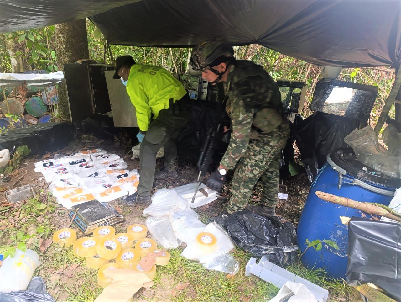Fue inhabilitado un laboratorio para el procesamiento de clorhidrato de cocaína con 400 kg de cocaína en solución y 9 kilos de este estupefaciente, ubicado en el Zulia, Norte de Santander, gracias a una operación entre @COL_EJERCITO y @PoliciaColombia.