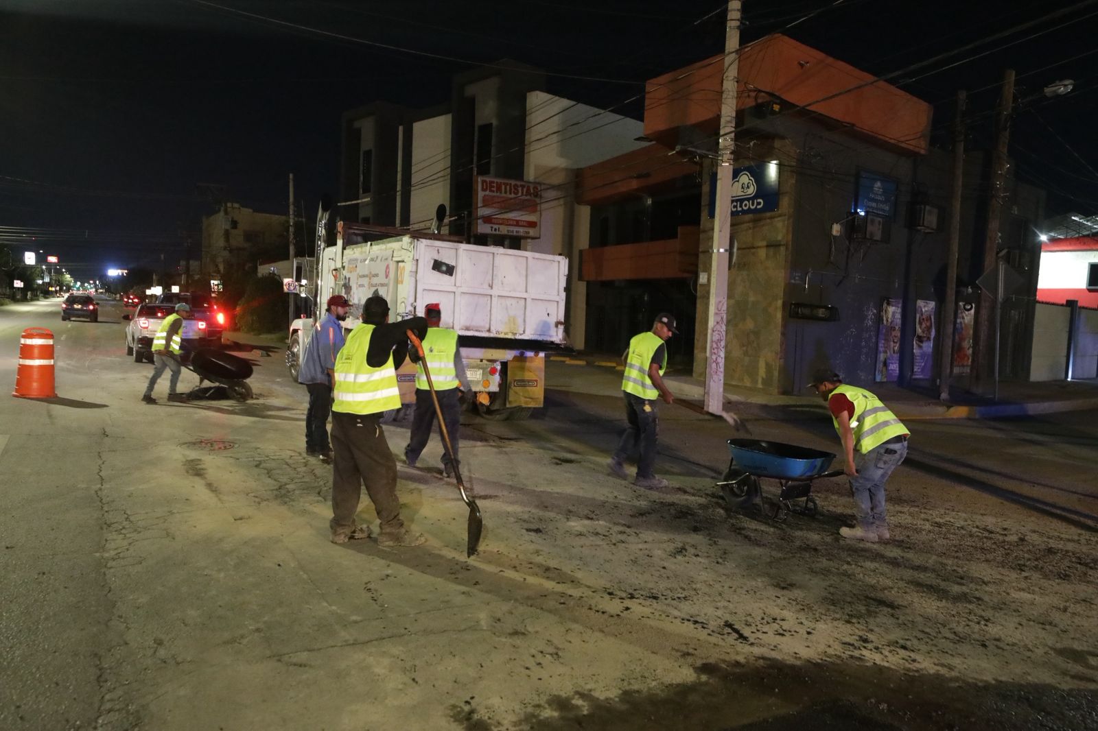 Cuadrillas de bacheo trabajan por la noche para mejorar vialidades principales en Juárez
