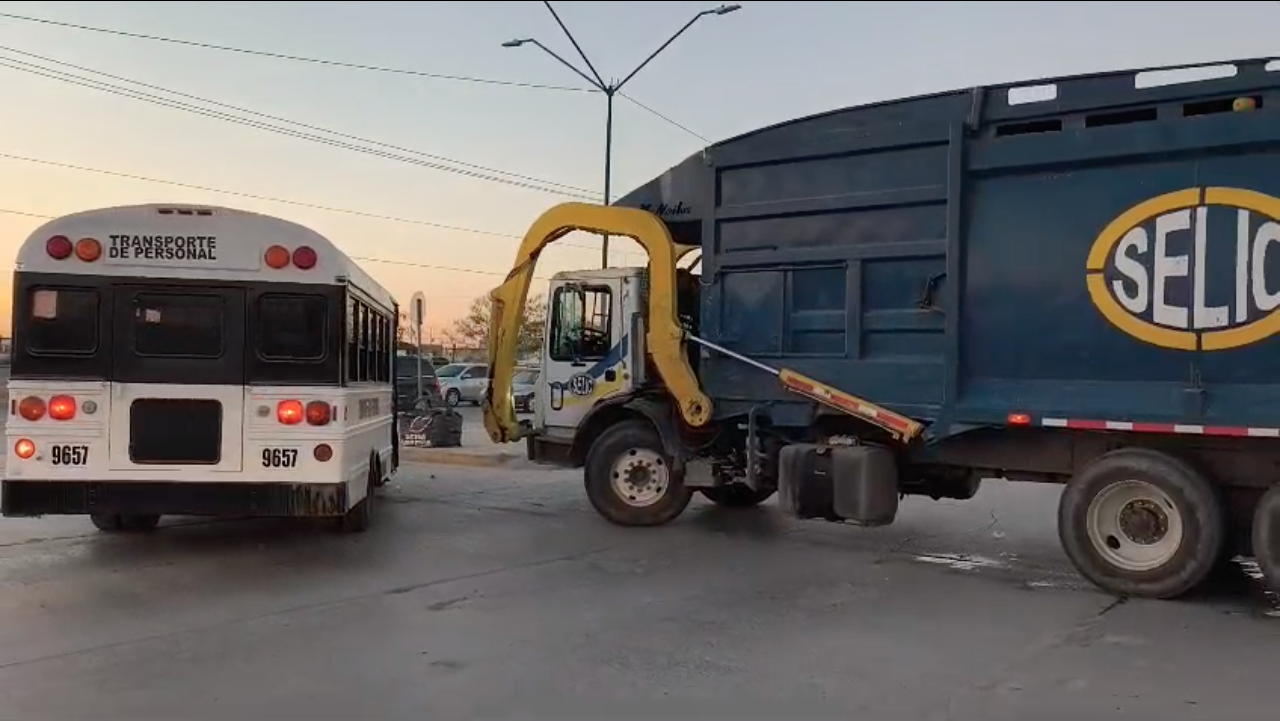 Ciudad Juárez, Chih.-Durante la mañana de este martes 30 de septiembre, se registró un choque entre un camión de transporte de personal y un camión recolector de basura en el cruce de las calles Puerto Dunquerque y Puerto Lisboa, en Ciudad Juárez.
