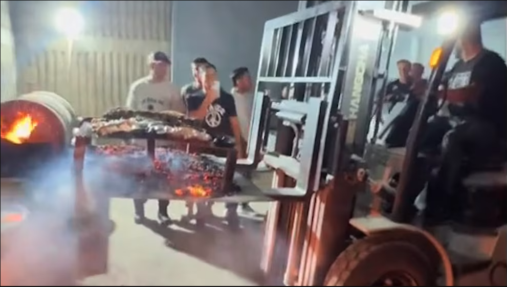 Lejos de rendirse, los presentes decidieron mover la parrilla encendida —con brasas y carne a medio cocinar— utilizando una mulita de carga, un pequeño vehículo que suele utilizarse en obras. Gracias a esta maniobra improvisada, lograron refugiar el fuego bajo techo y continuar la cocción.