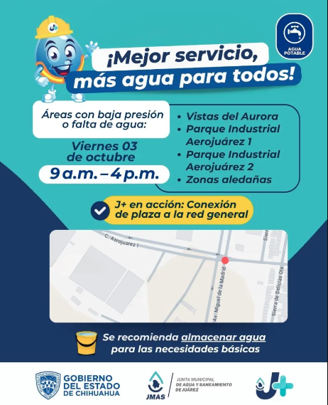 Ciudad Juárez, Chih.- La Junta de Agua y Saneamiento de Juárez (JMAS) informó que este jueves 3 de octubre llevará a cabo la conexión de una nueva plaza comercial a la red general de agua potable, lo que implicará la suspensión del servicio en varias zonas del suroriente de la ciudad.