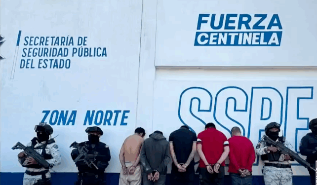 De acuerdo con el reporte oficial, los sujetos fueron capturados en posesión de cuatro armas de fuego, presuntamente utilizadas en la comisión del crimen. Los detenidos fueron identificados como Juan José J. J. y Eduardo L. J., ambos de 19 años; Mario Alberto A. M., de 25; José Guadalupe R. M., de 30, y Ricardo S. E., de 36.