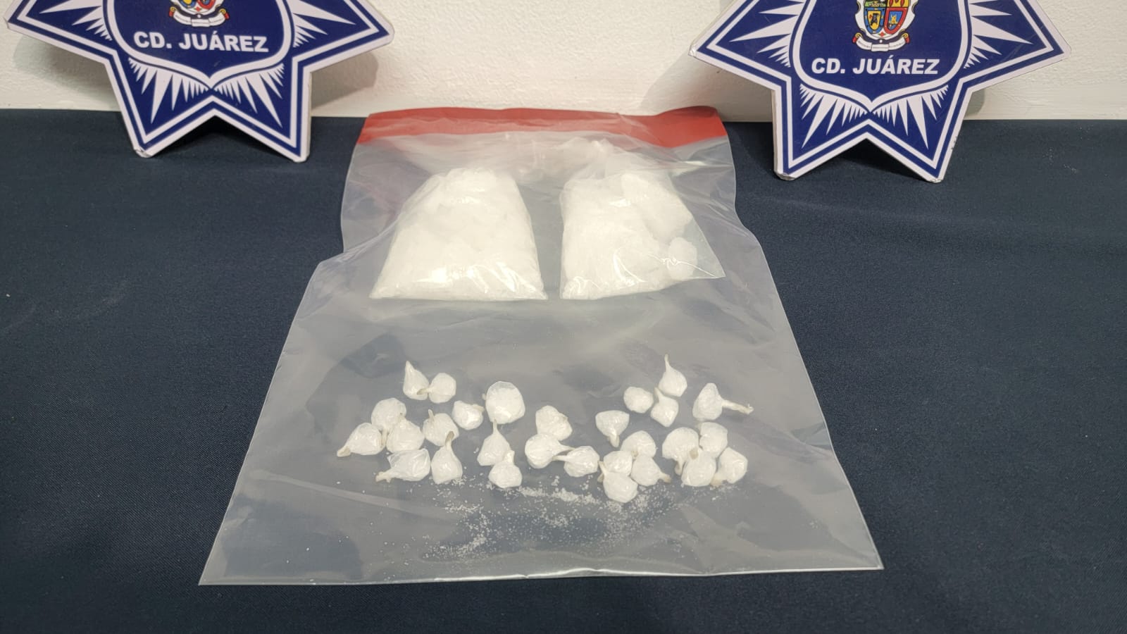 Durante la inspección al interior del vehículo, se localizaron dos envoltorios de plástico que contenían aproximadamente 200 gramos de la droga conocida como cristal, así como 28 dosis adicionales de la misma sustancia.