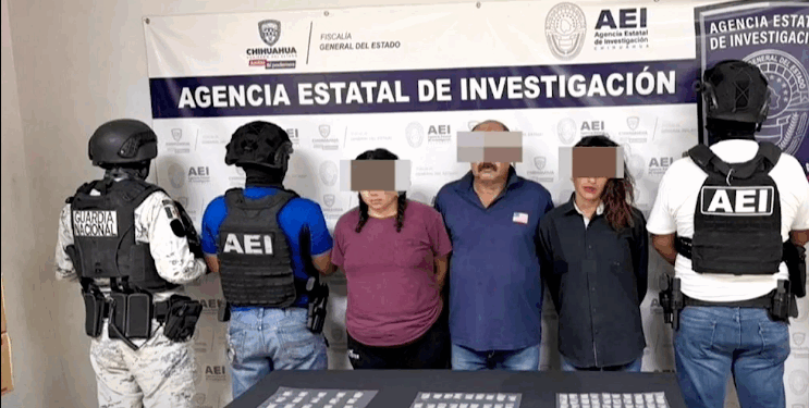 Ciudad Juárez, Chih.- Agentes de la Fiscalía General del Estado detuvieron a tres personas en posesión de droga durante un operativo en el fraccionamiento Portal del Roble. Los implicados, Giuliana D. J., Marisol H. N. y Daniel G. de C., fueron interceptados por elementos de investigación quienes, al realizar una inspección, localizaron entre sus pertenencias un total de 97 envoltorios con metanfetamina, equivalentes a 70 gramos.
