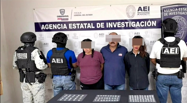 Ciudad Juárez, Chih.- Agentes de la Fiscalía General del Estado detuvieron a tres personas en posesión de droga durante un operativo en el fraccionamiento Portal del Roble. Los implicados, Giuliana D. J., Marisol H. N. y Daniel G. de C., fueron interceptados por elementos de investigación quienes, al realizar una inspección, localizaron entre sus pertenencias un total de 97 envoltorios con metanfetamina, equivalentes a 70 gramos.