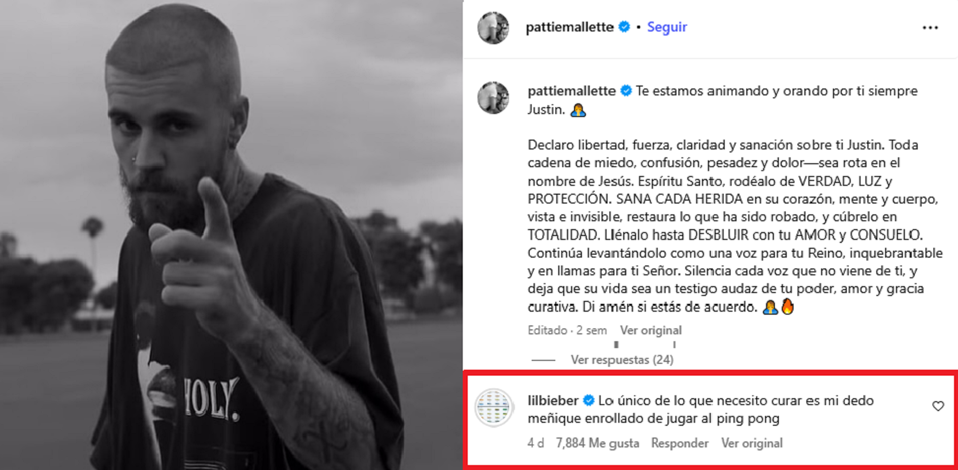 Dos semanas después, el 8 de octubre, Bieber dejó su comentario: “Lo único que necesito sanar es mi dedo meñique del pie que me torcí jugando ping pong.” El tono desenfadado desató carcajadas y emojis entre sus fans, quienes celebraron la respuesta como una señal de estabilidad emocional y buen ánimo por parte del artista.