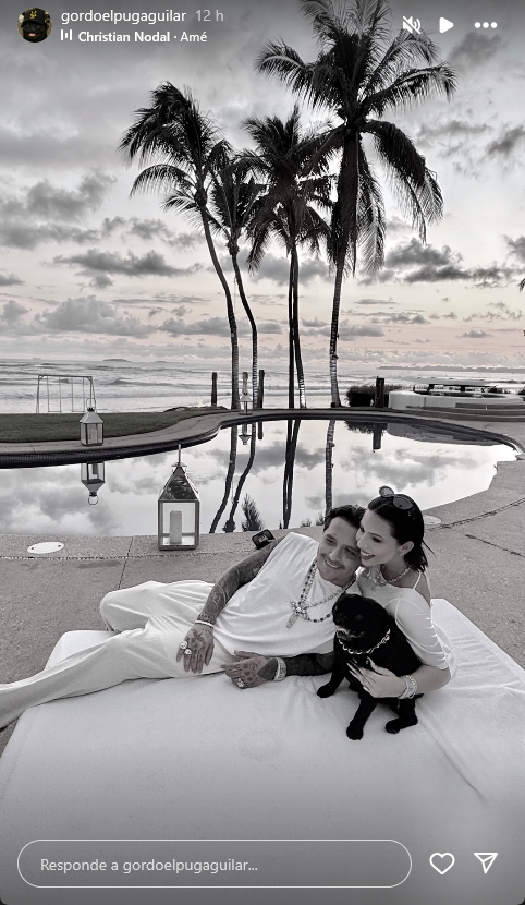 En la foto se ve a la pareja abrazada frente al mar, ambos vestidos de blanco, en un camastro junto a su mascota. El post fue acompañado del mensaje: “Celebrando la vida de mi adorada Ángela Aguilar”, con la canción “Amé” de fondo, interpretada por Nodal.
